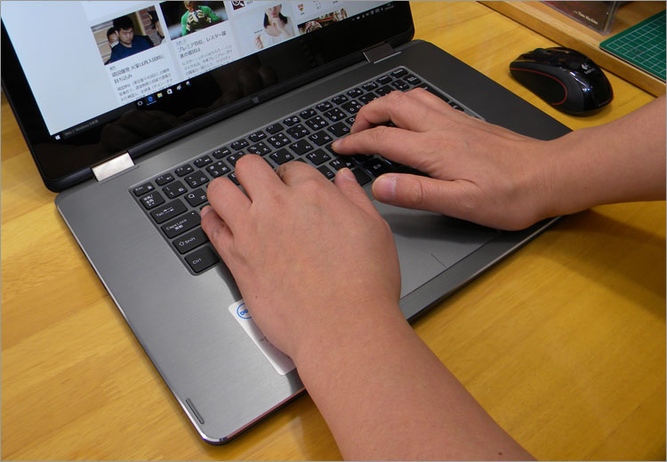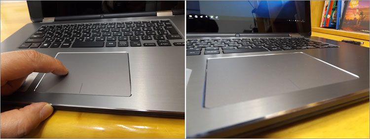 キーストロークでは、最近のノートでいう平均的な押下。2in1ノートだから浅くなるような印象があるが、至ってスタンダードノートと変わらない。