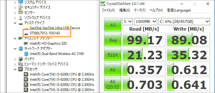 Inspiron 15 7000シリーズ(7568)ではSSDが搭載できるが、レビュー実機ではシーゲート製の500GB HDDを搭載している。アクセス速度は上記の通り。シーケンシャルで100MB/sは超えてほしいところだが、まあこんなものか。