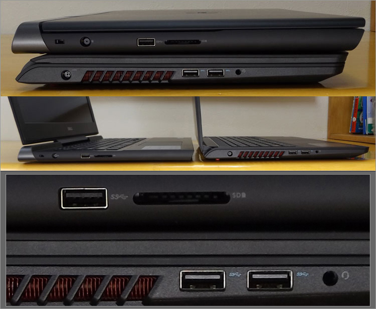 上に置いたのが今回のInspiron 15ゲーミング(7567)である。Inspiron 15ゲーミング(5576 / AMDモデル)のほうが、若干薄型で排気スリットの数も左側面の分多い。個人的な印象だと、ins7567がボテッとしており、ins5576のほうがシャープなデザインと言える。個人的にはins5576のほうが好みである。