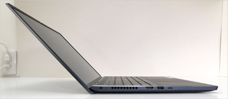 右側面。後方に排気口を配置されており、放熱フィンも確認できる。USB端子は中央より少し手前にあるので、有線マウスなど接続ケーブルが少し邪魔になるかもしれない。