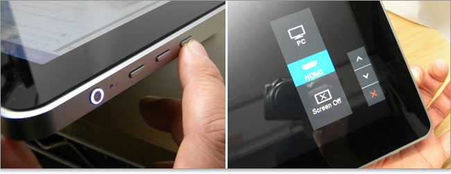 3つあるOSDキーは直感的に操作できる。例えばディスプレイの入力では、PC側、HDMI入力側、スクリーンオフのように表示が出るので、任意のボタンを押すだけ。ついつられてディスプレイをタッチしてしまいがちだが、ここはOSDキーを押さなくてはならない。ここでディスプレイ上での輝度増減調節が可能。
