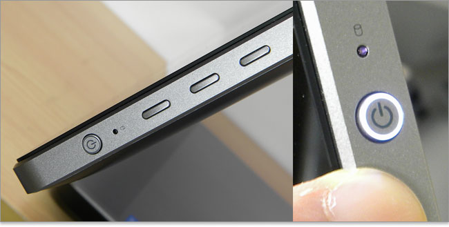 側面からInspiron 23のディスプレイ側面を見てみる。左側面には特記すべきものはない。右側面では、OSDキーx 3つ、電源ボタン、HDDアクセス・ライトが配置されている。