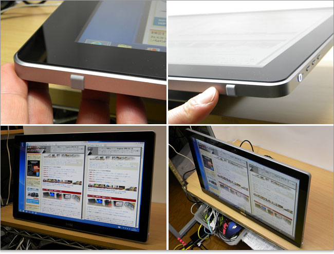 ディスプレイ側面の下部では2箇所に緩衝ゴムが設置されている。これによりInspiron 23のディスプレイそのものを地べたに置くような設置が可能。一見、かなりの大画面タブレットを立てているようにも見える。