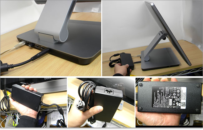 Inspiron 23では外部電源のスタイルをとっているので、ACアダプタが必要となる。電源コネクタの接続はちょうど背面中央のあたり。AMD Radeon HD 8690A のGPUを搭載していることもあり、180WのACアダプタを採用している。ケーブルは一般的なデスクトップパソコンと同様に太めである。