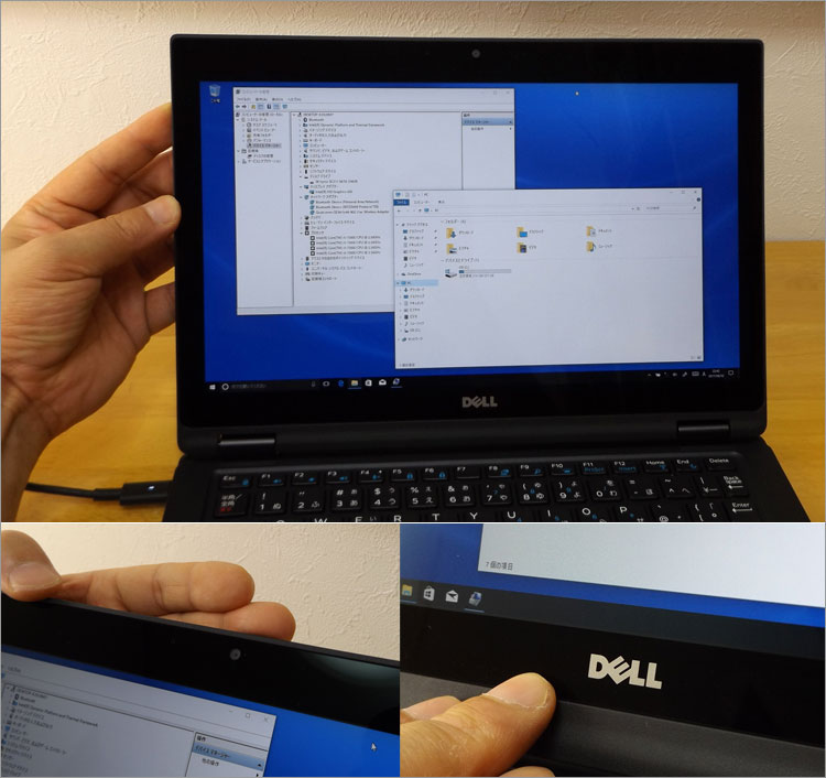 ジャイロセンサーで、画面の縦横をオート切り替え。Windowsの設定により任意で固定も可能。中央下の位置にはスタートボタンではなくDELLロゴなので、触れて誤操作することはない。一昔のタブレットは掴んでいる親指でスタートボタンを押してしまうストレスがあった。