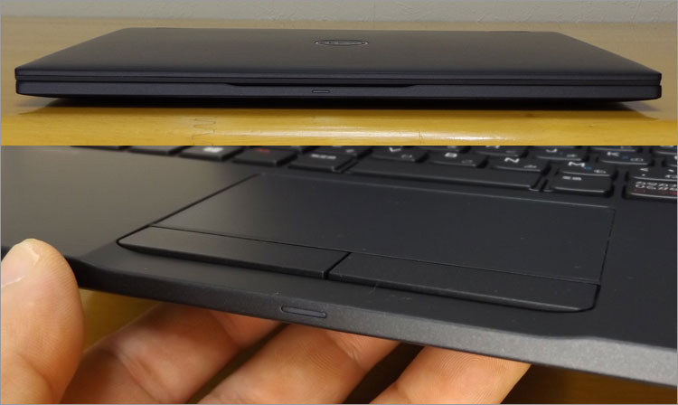 天板にはシリコン・コーティングが施してあり、滑らかな手触りとなっている。わりと薄めのコーティングなので、しっとりというよりはサラッとした手触り。中央には少し窪んだシルバーのDELLロゴを配置。