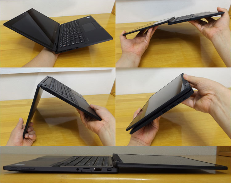 ノートからタブレットへ変形する過程。180度オープンもできるので、外部モニタに接続した際にもディスプレイが邪魔にならない。ディスプレイは一定の角度まで折りたたむと、キーボードが無効になるので、そのままタブレットとして移行できる。なお、可変の過程で、テントモードやスタンドモードなど応用した使い方もできる。