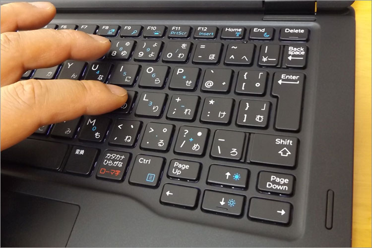 F10のところに「キーボード・バックライト」のキーがあり、オン・オフできるので、プロジェクタ使用時の会議室など暗い場所で活躍する。発光する印字部分は、かすれることなくくっきりしており見やすい。