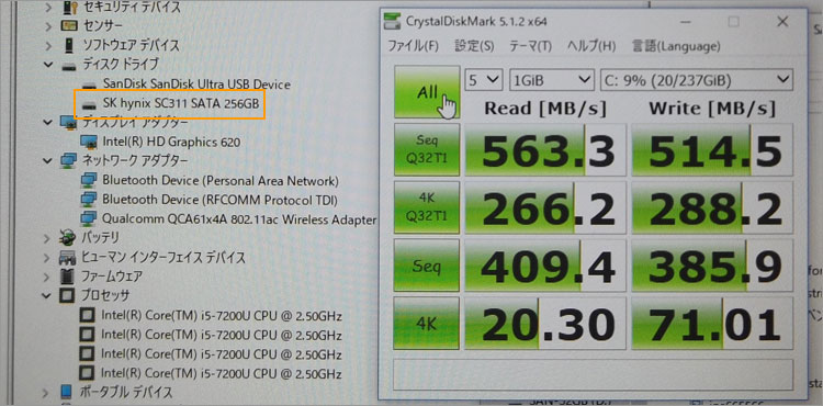 SATA接続のM.2 SSDを採用しており、このLatitude 5289 2-in-1レビュー実機では、SKハイニックスのSC311を搭載。アクセス速度のパフォーマンスはこのとおりとなった。だいたいトレンド通りだが、比較的記録速度が速い印象。購入時期により採用製品は異なるので、あくまで目安程度に。