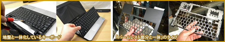 各キーの位置がくり抜きされた「パームレスト部分と一体」のタイプ。つまりキーボードの地盤もそのままパームレスト全体の一部となっている。そのため、キーボードの ”たわみ” ははとんどなく良好。