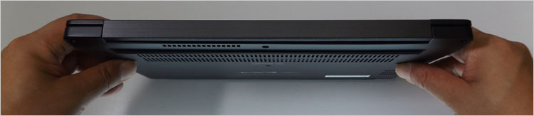 底面もアルミ素材。こちらにはシリコン・コーティングはないので、梨地のざらざらした手触り。排気口はヒンジの間にあり、あまり理想的とは言えないが、比較的低発熱の内蔵グラフィック仕様なのでまず問題なさそうだ。端子のある側はパームレストの板をプレスして一体化している。いわゆるユニボディ。