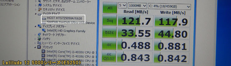 今回の実機Latitude E5250で搭載されていたHDDは、日立グローバルストレージテクノロジーズ (HGST)製。ウェスタン・デジタル社の傘下となったHDDメーカーである。 Latitude E5250というよりはこのHDDのパフォーマンスをチェック。