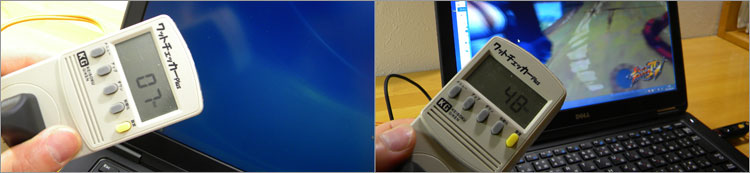 アイドル時では7W、ストリートファイター4ベンチマーク中では48Wあたりの消費電力。(モニタ輝度MAX、満充電状態にて)