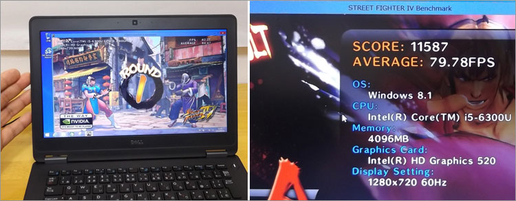 ストリートファイター4(1280×720 ウィンドウ表示)では、79.78FPSを記録。快適プレイのRANK A。過去と比べると、内蔵グラフィックとしてはかなり高パフォーマンス。過去のレビュー機と比較すると、GeForce GT 330M 1GBを搭載したDELL Vostro 3700に近かった。また、GeForce GT 420M搭載のXPS 14(L401x)よりも少し高いFPSをマークしている。