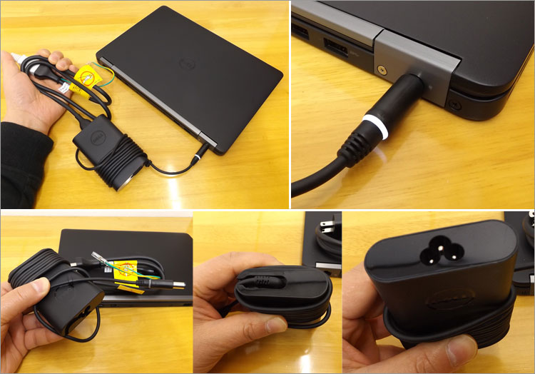 65WのACアダプタが付属。プラグが白LEDで点灯する。電源ケーブルはアース付きの3ピンコネクタであり、ケーブルが太く取り回しはよくない。なお、90W ACアダプタのチョイスもある。