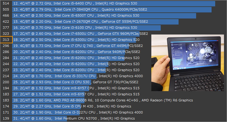 今回のDELL Latitude 12(E7270) に近いパフォーマンスの過去PCをピックアップ。通常版だと 第3世代Core i7-3612QM、第4世代Core i5-4200Mに近い性能とみて良さそうだ。 一世代前のBroadwell設計で比較すると、Core i7-5500U に近かった。