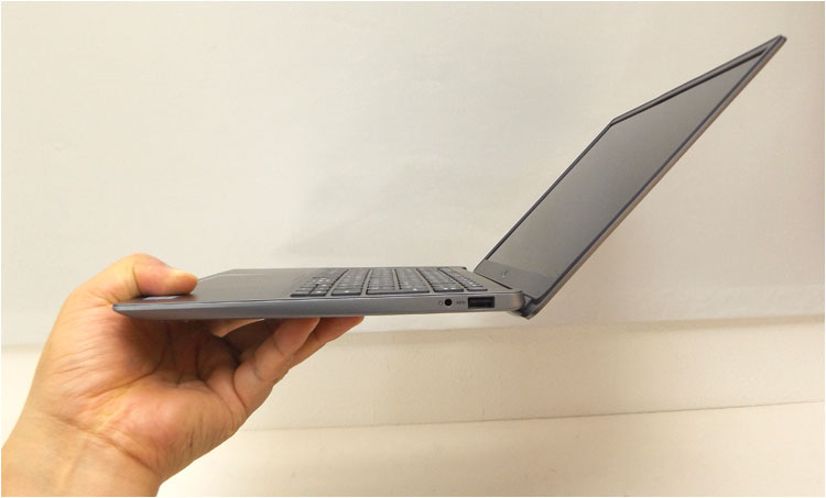 今回レビューする「アルミニウムモデル」は、天板とパームレストの素材がアルミであり、わりとプレミアム感がある。ディスプレイではフルHD(1920 × 1080)解像度搭載で、広視野角のIPSパネルを採用している。約6mm幅・狭額ディスプレイベゼルのフレームレス・デザイン。タッチパッドはダイヤモンドカット加工でアクセントになっている。