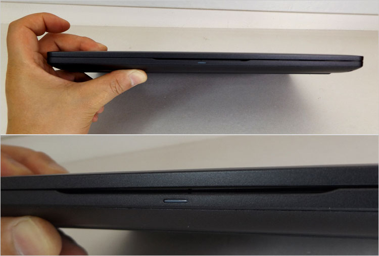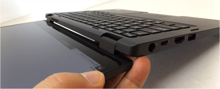 また、支えている手の指先では、本体背後キーボードのプチプチ感が気になってしまうのもご愛嬌。 2-in-1タイプを選ぶ場合は、「ノートパソコンがあくまでメインであり、タブレット用途はおまけ機能」と捉えておけば、購入後の後悔はないだろう。やはり、軽量でお手軽な専用タブレットPCとは、ニーズがちょっと変わってくる。狭額ディスプレイベゼルなので、実質つかめるベゼルはヒンジがある方の一辺のみ。(この写真でいうと左側のベゼル)