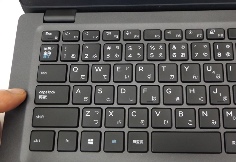 触ってみた感じでは、パームレストの材質はポリカーボネート(工業プラスチック)で間違いないだろう。天板と同じくガンブラックのカラー。キーボードパーツでは、英字キーボートやバックライト機能付きのものが選択できるが、ここで紹介しているLatitude 5300実機は「バックライト機能なし」の日本語キーボード。