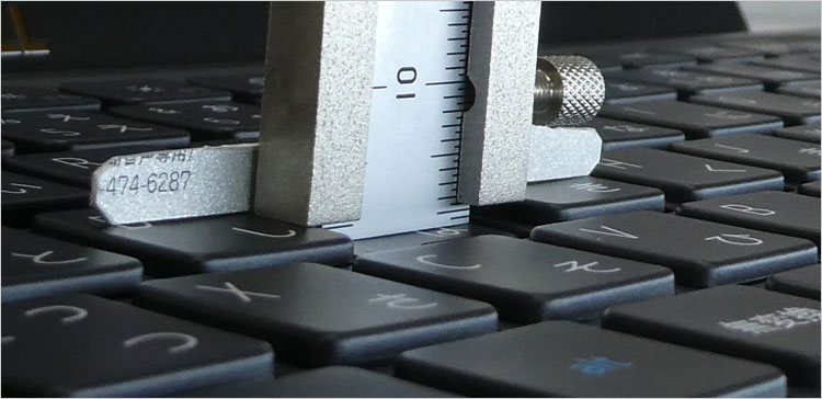 キーストロークでは少し改造した直尺で測量した。0.1mm単位なんて家庭で厳密に測れるわけないが、可能な限りチェックしてみる。1.5mmを指しているが歪みとかを考慮しても1.4mmは確実にありそう。比較的しっかりした打鍵感のあるキーボードと思われる。