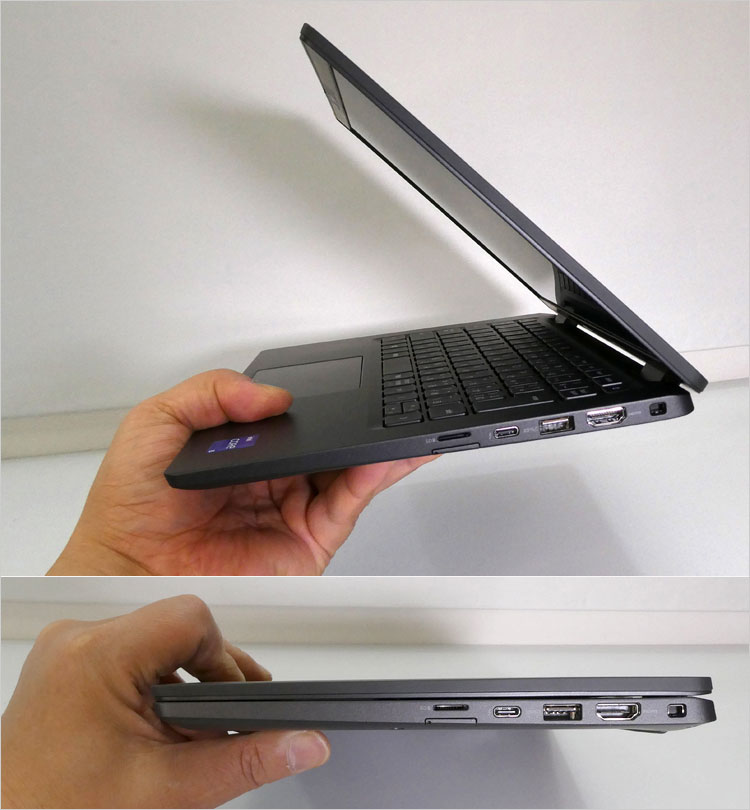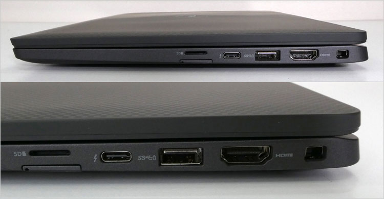 右側面には、microSDカード・スロット、microSIMスロット(WWAN構成のオプション扱い)、Thunderbolt 4(40Gbps)、USB 3.2-Gen1(1レーン・5Gbps)、HDMI端子、セキュリティロック・スロットを配置。