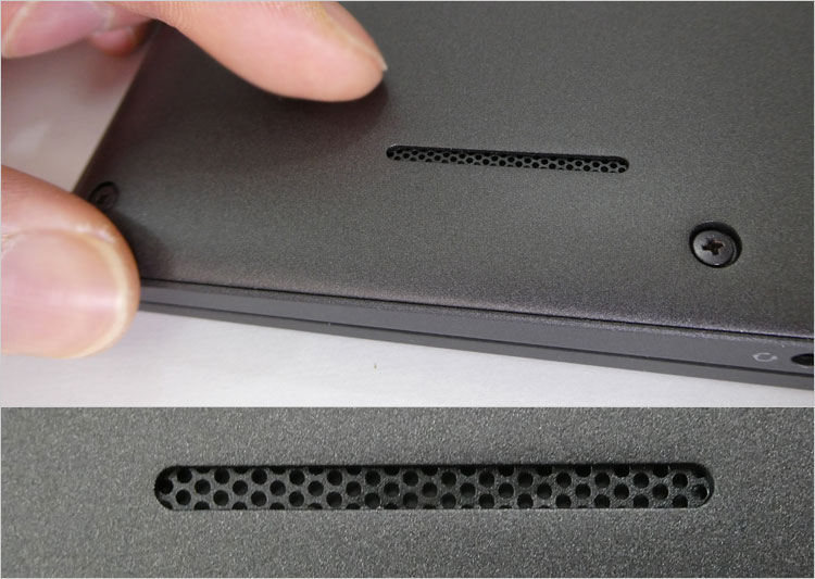 左右に2箇所、ほぼ底面に位置するスピーカー孔。スタンドゴムで浮かして空間をとっている。2W(ピーク時2.5W)のスピーカーだが、この規模にしてはサウンドクオリティは悪くない。さすがに大勢に向けた大音量は厳しいが、プライベートの娯楽やビジネスではこれで十分かと思われる。