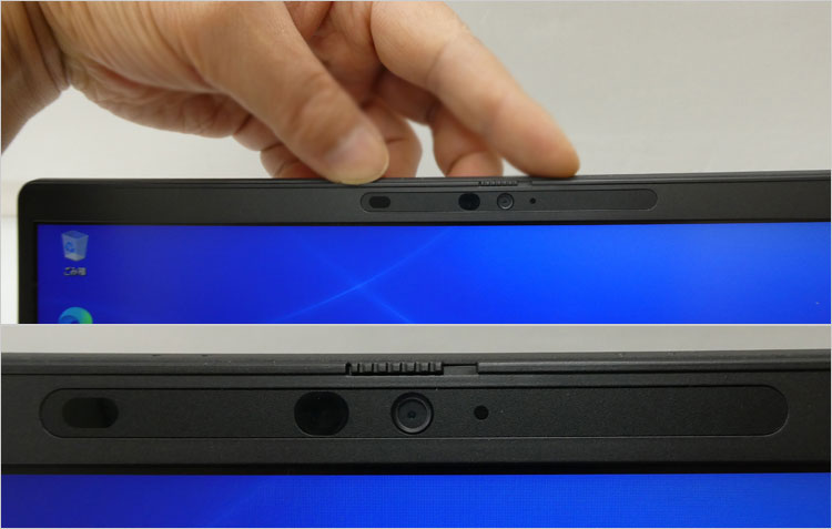 この実機ではオプションのIR(赤外線)カメラ仕様になっており、ベゼルにIR エミッタ、IRカメラ、近接センサー、カメラ ステータスLED、周囲光センサー(ALS)が搭載されている。Windows Helloを使うことで、覗き込むだけでログインできる。キーボードでパスワードを入力する手間が省けるハンズフリー機能。