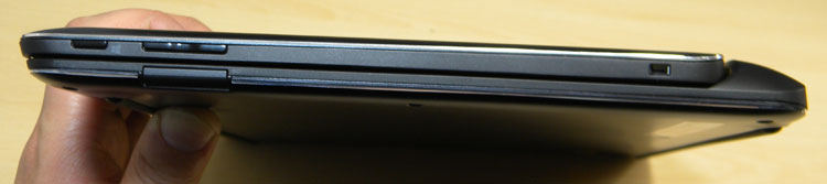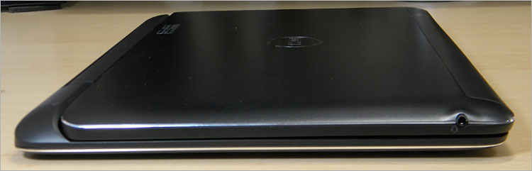 タブレットの側面に、電源ボタン、Windowsボタン、ボリュームボタン、ヘッドフォンジャックがある。見ての通りタブレット部分は、USB端子など外部デバイスと接続するインターフェースを持たない。基本的にはキーボードドックとセットで持ち歩くのが基本となるだろう。(ウルトラブックとしてモバイルする)