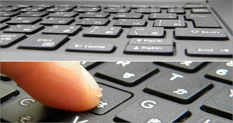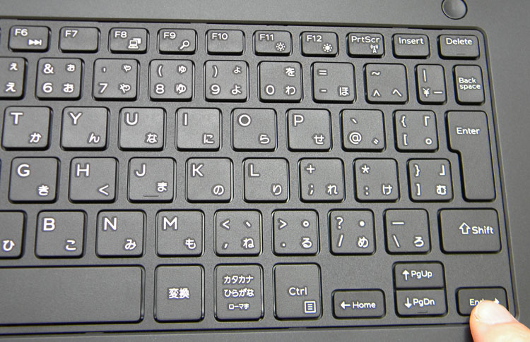 キーストロークが浅く、あまり打鍵感を感じない。パチパチではなく、ペタペタと地味にタイピングしている感じ。キートップがフラットなので指先に馴染むこともない。やんわりと静かに打ちたい人にはいいのだろうが、がっつりしたいパソ兄さんの好みには合わない。DELL Latitude 12 5000シリーズ(E5250)で採用しているキーボードのほうが断然好みである。