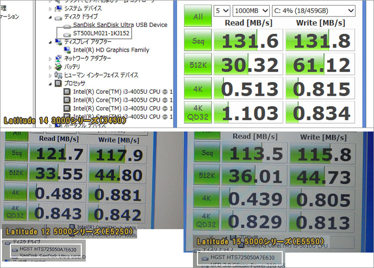 今回のLatitude 3450に搭載されていたHDDはシーゲート製であったが、Latitude E5250やE5550レビューで搭載されていたHGST製よりも若干パフォーマンスが高めだった。ただし個体差もあるだろうし、どのHDDメーカー製が搭載されるか決まっているわけではないので、余興としてみてほしい。そもそもこのくらいの差では体感できるレベルではない。