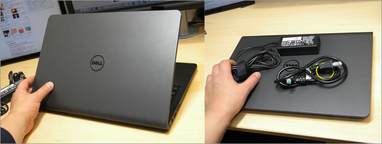 天板中央にDELLロゴ。65W-ACアダプタが付属。Latitude 15 (3550)本体の最小重量は2.2 kgとなっている。