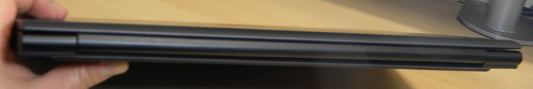 底面の様子。前面にステレオスピーカを内蔵。底面から吸気口のスリットが見える。排気口はヒンジの隙間となっているが、内蔵グラフィック仕様のノートなのでとくに問題視しなくてもよさそう。