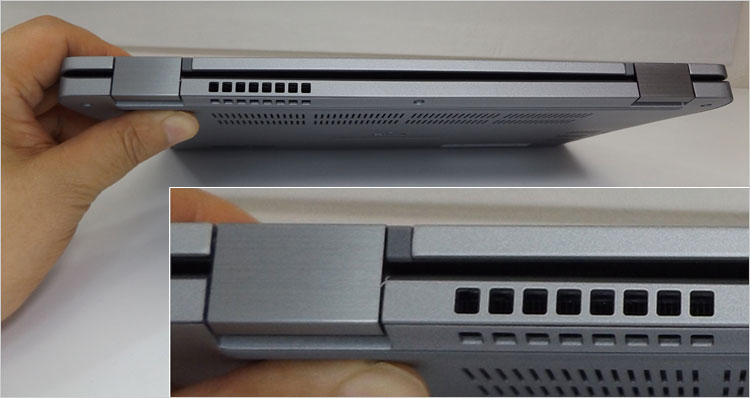 Latitude 5310 2-in-1の背面。シングルファン内蔵のため、左端に排気口が1つ。下段(底面寄り)にもスリットが配置されている。