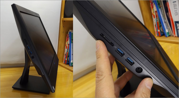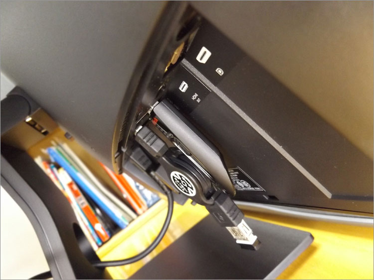 ここで注目すべきところは、HDMI端子の入力と出力の2つを持つところ。サブモニタとつないでデュアルモニタ構成が可能だし、サプPCとつないで単にモニタとしても使える。