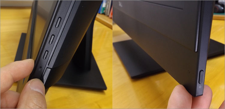 また、右側面の下には3つのODSボタンがあり「輝度調整ボタン × 2、入力切り替えボタンを配置。そしてHDDアクセスランプの配置。しばらく間があいて下の方に電源ボタンを配置している。