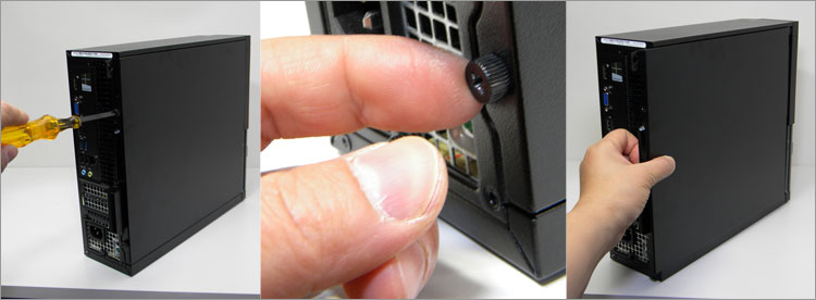 サイドパネルは2つのネジで固定されている。手回しネジなので固く閉めなければ工具なしで内部にアクセスできる。