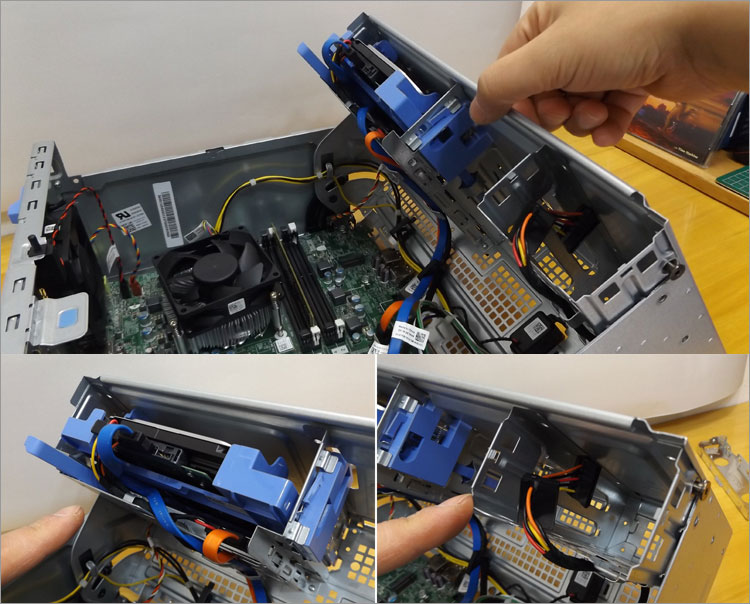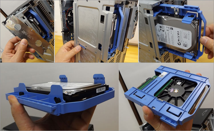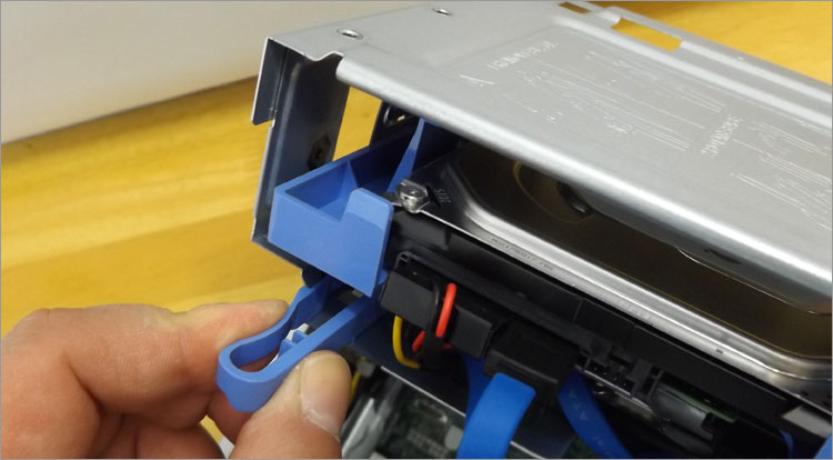 3.5インチHDDは観音開きせずに簡単に取り外せる。横のボタンを押し、取っ手を持ち手前に引くだけ。(シールドのプレートやケーブルは予め外す)