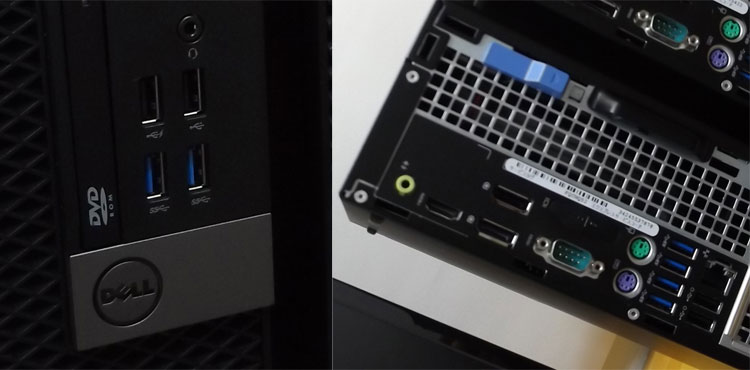 USB3.0端子×6基、USB2.0端子×2基を装備。前面USB2.0端子の1つはPowerShare対応。モニタ出力にはHDMI端子、Display Port 端子 × 2基を装備しており、VGA端子はオプション対応。ビジネスPCらしく、レガシーポート(PS/2コネクタとRS-232Cシリアルポート)を装備。また、ギガビットイーサーLAN端子を装備。