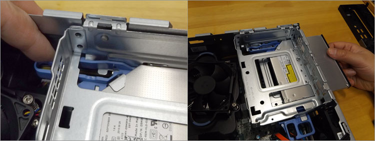 メモリスロットにアクセスするには、HDD&光学ドライブの共用マウンタを取り外す必要がある。輪っか状のレバーを引き、傾けて持ち上げると共用マウンタが取り外せる。