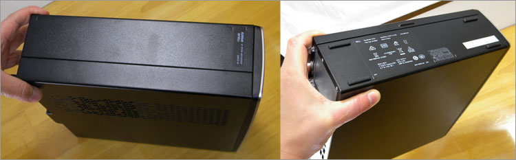 高さと奥行ではだいたい29センチくらい。重量は3.2kgほどで、片手で鷲掴みできるくらい軽量。従来のスリムタワーよりも大分コンパクトになっている。しかし、Atom系であるCeleron N3050 を搭載し、拡張スロットを撤廃したPCとしては、「でかい」というしかない。