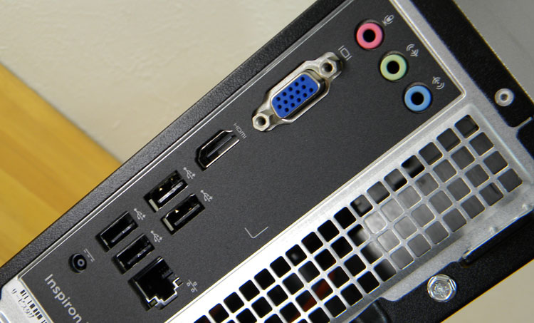 背面のオンボード端子。USB2.0端子×4基などを配置。モニタ出力にはVGAとHDMIがある。Inspiron 3252はスロット自体がないので、グラフィックカードの搭載ができない。そのためVGAかHDMIか、いずれかの出力となる。なお、HDMI出力で、WQHD(2560 × 1440)モニタのネイティブ接続が可能だった。
