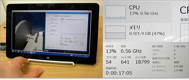 バックグラウンドで何やらデータが動いていると60~80%の使用率であったが、それらを抑えたあとは13%前後で安定した。2D高精細コンテンツは余裕でこなせることが分かった。メモリは2GBで控えめであるが、使用率は再生時で50%前後。あれこれアプリを同時起動しない限りは問題ないと思う。消費電力はアイドル値5Wから再生時は9~10Wへと変化した。