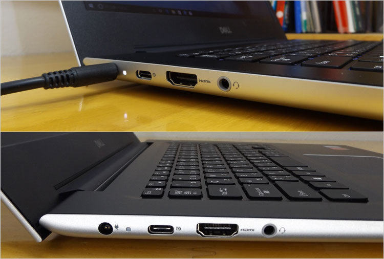14インチ非光沢ディスプレイ、広視野角のIPSパネル フルHD(1920 × 1080)搭載。天板・底面・パームレストがアルミ素材であり高級感がある。デザインとして部分的に若干鋭利なので、角にぶつけたりしないよう注意したい。バックライト・キーボード搭載。USB Type-C端子には、USB3.1-Gen1ほか、USB Power Delivery、Display Port に対応。単体GPUでは、ローエンドだがAMD Radeon 530が搭載できる。 光学ドライブは搭載しない。 |