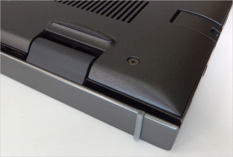 ヒンジの間(ディスプレイと本体の中間)に排気口を配置している。ディスプレイを大きく開いたほうがエアーフローにとっては有効的な印象。2箇所のスリットが確認できるが、この手前側のは貫通しておらずダミーデザイン。機能しているのは奥の1箇所で、シングルファン内蔵の作りになっている。冷却面でいうと、内蔵グラフィックどまりにしておいたほうが無難な設計だろう。