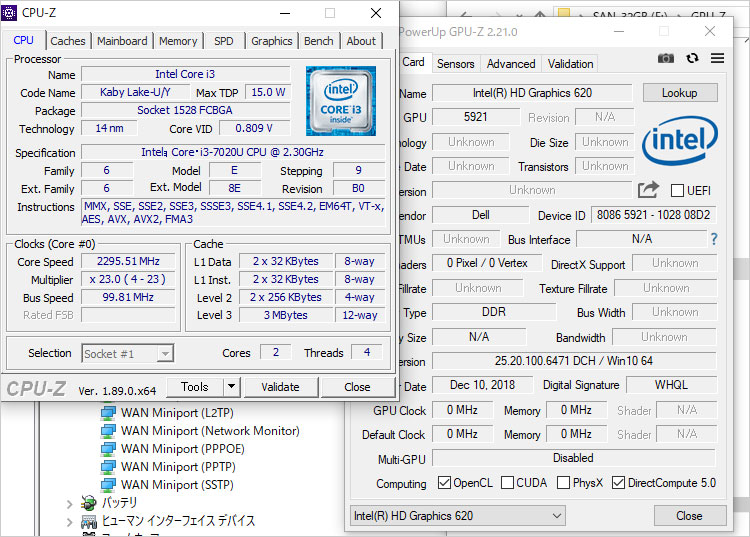 今回のVostro 15 (3581)ではCore i3-7020Uを搭載している。TDP 15Wなので低消費電力。2コア実装 / HTテクノロジーによって4スレッド動作、クロック数は2.3GHz でターボブースト機能は無し。このとおりエントリー向きのプロセッサだ。統合するグラフィックとしてインテル HD グラフィックス620を内蔵している。