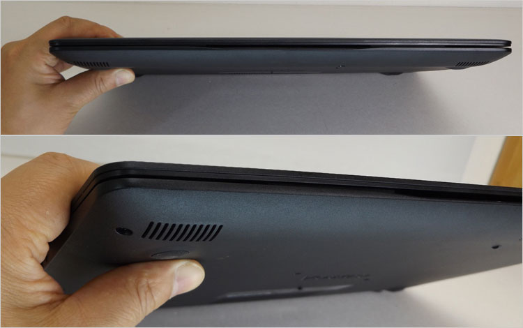 底面も天板と同じくポリカーボネート(工業プラスチック)材質。底面から端子がある側面まで一体型であり、トレイみたいな形状に成形されている。これはつなぎ目が少ない「ユニボディ設計」であり、比較的堅牢性に長けた設計である。