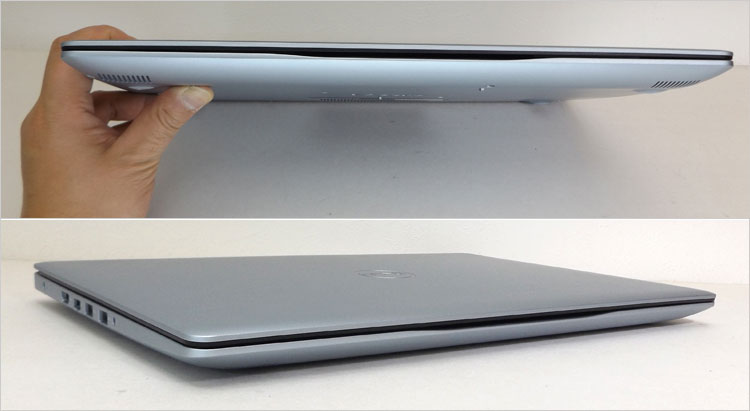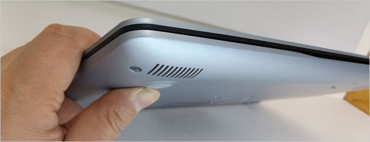 天板、底面、パームレストに至る外装はポリカーボネート(工業プラスチック)なので、まさに低価格モデルらしい。上位モデルにあるようなプレミアム感はない。この実機のカラーバリエーションは「アイス グレー」といい、わずかに青みを帯びたシルバーカラー。これをなぜグレーというのか腑に落ちない。他にはブラック・カラーもラインナップされている。