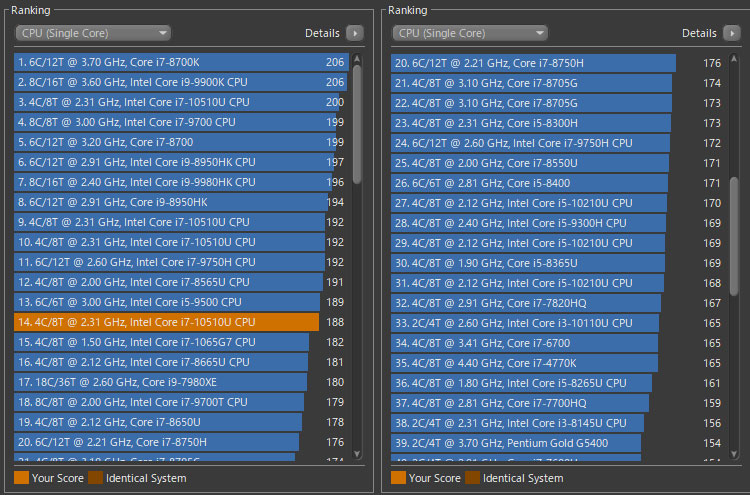 今回のCore i7-10510Uではマルチスレッドのスコアが644。当方の調査内ではRyzen5-1400に近い。なお、CINEBENCH R15の結果がCPU性能の全てではないのでご留意を。