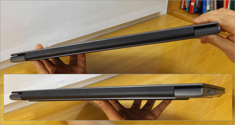 幅:380 mm × 奥行: 253 mm × 厚み: 19.2 mm。15.6インチノートで2センチ未満の厚みなので、薄型スタイリッシュのデザイン。重量が2kg未満なので、モバイル用途にしてもさほど無理はない。