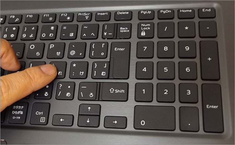 2016年ごろから見かけるようになった、一部のキーを隣接させキートップの段差で切り離している加工。プレートの穴開けが英字キーボードと一致していることから、加工を共通化させてコストダウンを図っているようだ。展示会イベントでDELLの社員にも聞いたが、グローバルメーカーゆえ、日本仕様のためだけにコストを掛けるのは社内で圧力がかかるらしい。もちろん、グローバルでの共有化がコストパフォーマンスにつながっており、ユーザーにも有益な面もある。